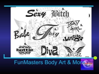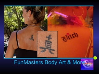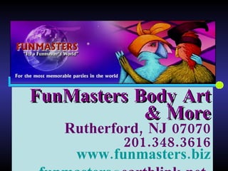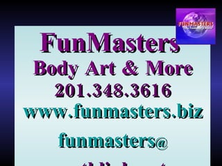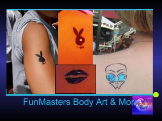 Funmasters Body Art & More offers airbrush tattoos and entertainment services for various events, including birthday parties and charity balls. With 20 years of experience, they provide professional performers to deliver enjoyable experiences across the tri-state area. Interested clients can book their services by visiting their website or calling their contact number.