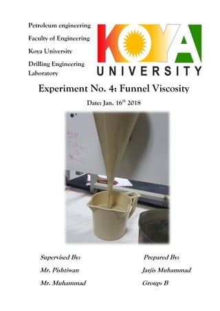 The document details an experiment on funnel viscosity using the Marsh funnel to measure the change in viscosity of drilling mud. It includes the aim, theory, procedure, and common questions related to the experiment, emphasizing the quick and straightforward nature of the test. Key factors affecting viscosity, advantages of the method, and specific equipment use are also discussed.