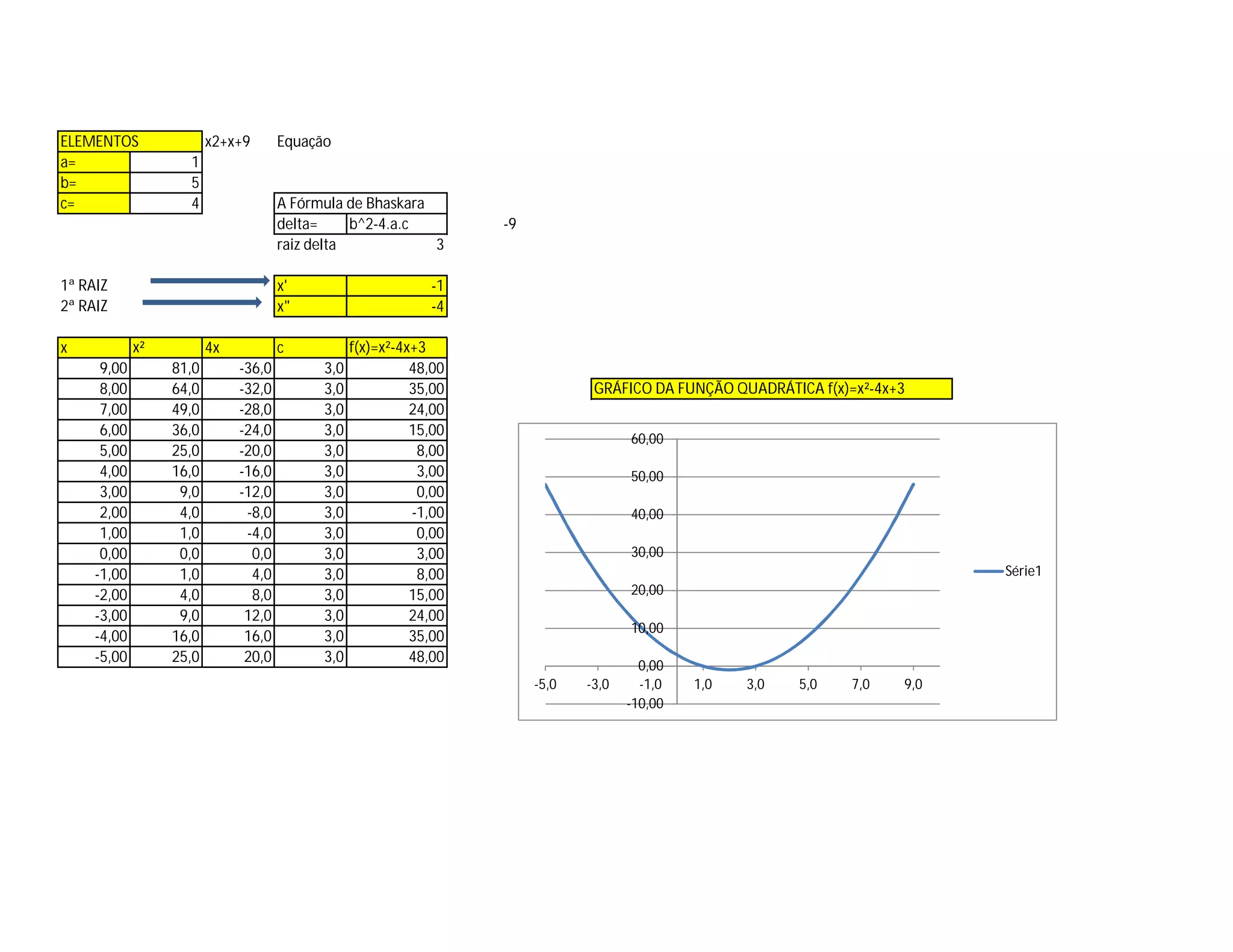 The document solves a quadratic equation with the formula x^2 + 5x + 4 and finds the two roots to be -1 and -4. It then graphs the quadratic function f(x)=x^2 - 4x + 3 by calculating the output for inputs from -5 to 9 and plotting the points.