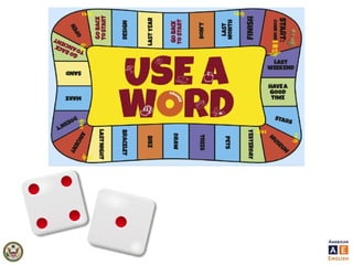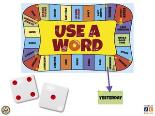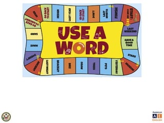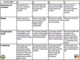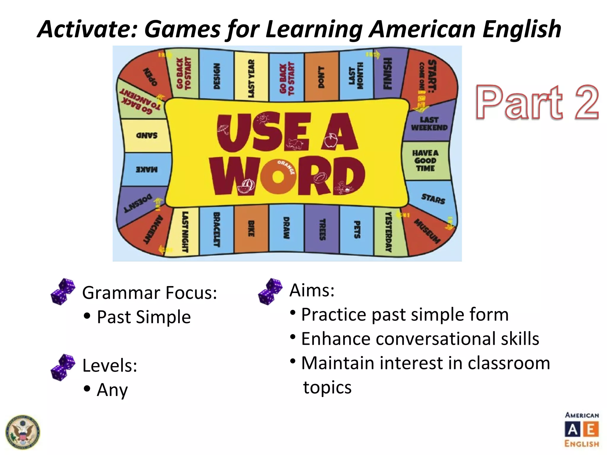 The document outlines games aimed at enhancing students' understanding of American English grammar, focusing on the past simple tense and group activities. It includes step-by-step instructions for games, encouragement of independent writing, peer correction, and provides templates for creating personalized board games. The document also emphasizes the importance of engagement and collaboration among students during language learning activities.