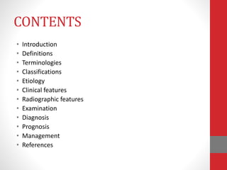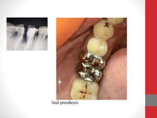 This document discusses furcation involvement in multi-rooted teeth. It defines furcation as the anatomic area where tooth roots diverge, which can be difficult to clean. The document classifies furcation involvement into various grades based on the amount of bone loss and discusses clinical features, diagnosis, and various surgical treatment options like furcationplasty, tunneling, root resection, and guided tissue regeneration depending on the grade of involvement. Maintaining good oral hygiene is important for prognosis. The goal of management is to eliminate periodontal defects in the furcation area through various regenerative and resective procedures.