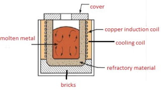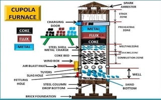 This document provides an overview of various types of furnaces used for high-temperature heating, including cupola, induction, and electric arc furnaces. It discusses their construction, operation, advantages, and limitations, emphasizing the principles behind each furnace type and their applications in melting metals. The document outlines specific processes such as charging, melting, and temperature control, as well as chemical reactions that occur during operation.