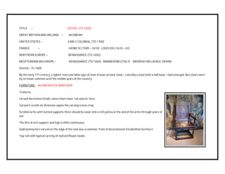 This document provides an overview of architectural and furniture styles from 1600-1800 across several regions of Europe and the United States. It is organized chronologically and outlines the dominant styles of each time period. Some of the key points include: