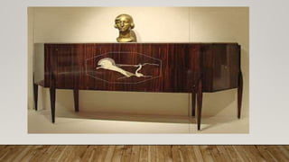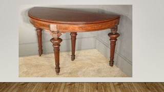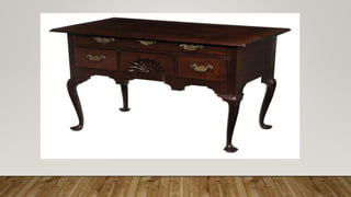This document discusses the different features and styles of furniture design over various centuries. It describes furniture styles from the 16th-17th centuries like Queen Anne and Georgian which featured cabriole legs and ball-and-claw feet. Later styles are also examined such as Victorian, Art Deco, Bauhaus, and contemporary designs with tapered legs, carved scroll legs, reeded legs, and trumpet legs. The purpose is to educate students on the evolution of furniture construction and design over time.
