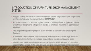 The Furniture Shop Management System facilitates the ordering and customization of furniture, allowing users to specify attributes and dimensions. Admins manage orders by assigning resources such as wood and tools to staff for timely completion. The system aims to provide an efficient user experience with functional and non-functional requirements designed to ensure quality and security.