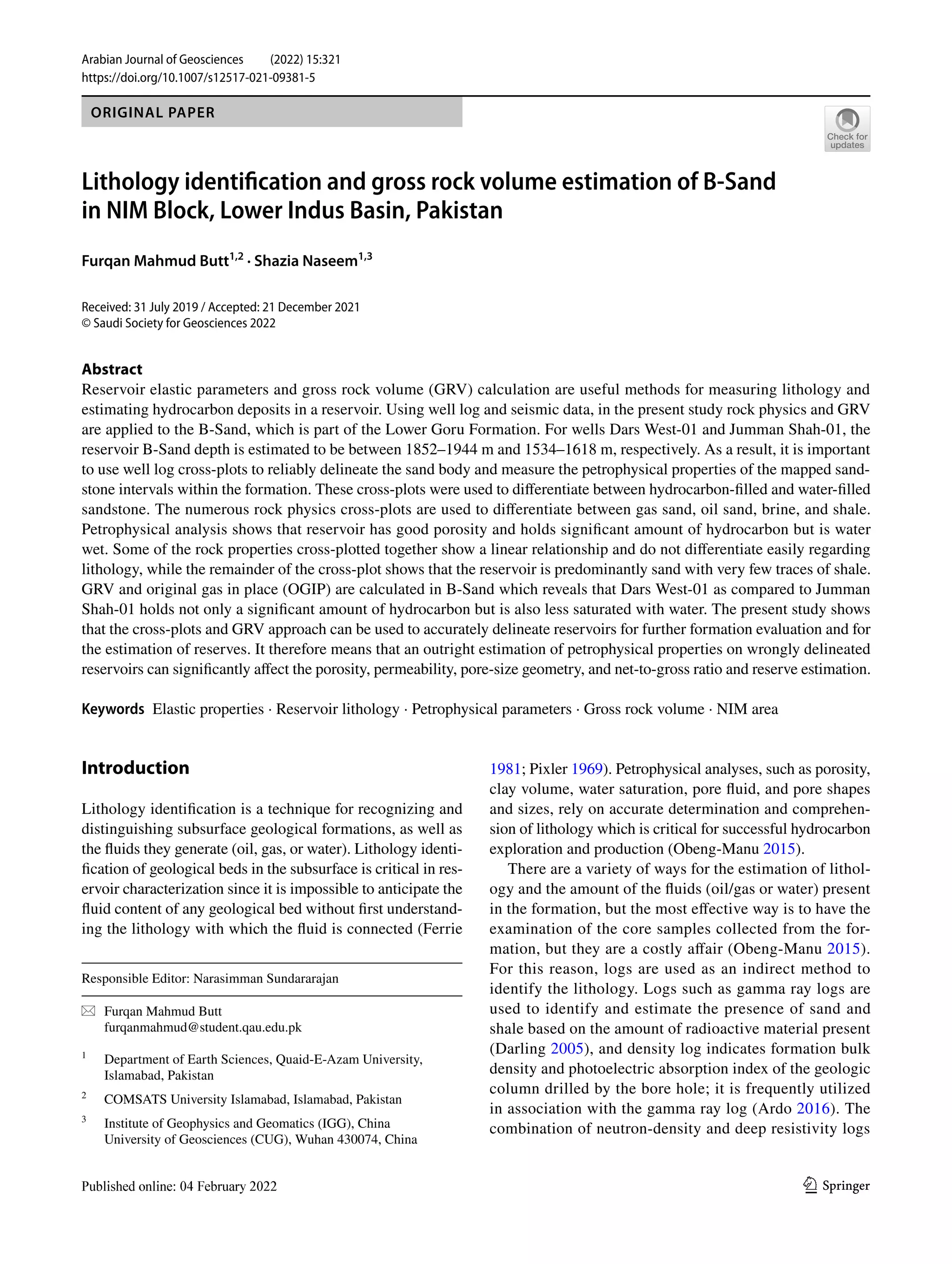 The document summarizes a study on lithology identification and gross rock volume (GRV) estimation of the B-Sand reservoir in the Lower Indus Basin of Pakistan. Well log and seismic data from two wells were analyzed using petrophysical and rock physics methods to identify the lithology and estimate reservoir properties. Cross-plots of elastic parameters helped differentiate lithologies including gas sand, oil sand, brine, and shale. GRV was calculated to estimate hydrocarbon volumes, showing the Dars West-01 well has more hydrocarbons and less water saturation than the Jumman Shah-01 well. The integrated analysis provides insights for accurate reservoir delineation, evaluation, and reserve estimation.