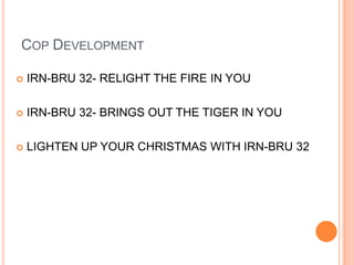 This document discusses further development of Task 5, including concepts for Irn-Bru 32 slogans to relight or bring out the tiger within customers. Rough draft designs are presented for a regular and tall can of the soft drink. The draft designs are basic and lack professional quality, and further development is needed to improve the overall design product.