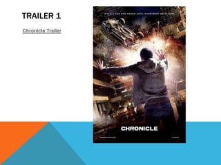 This document summarizes and analyzes three movie trailers. It provides details about the trailers' techniques, tones, and conventions. The Chronicle trailer uses a hand-held camera style and follows teenagers with powers. The Man of Steel trailer uses establishing shots and a voiceover to reveal Superman at the end. The Bourne Legacy trailer is mysterious, slowly revealing the main character through fast-paced editing and a transition from black and white to color.