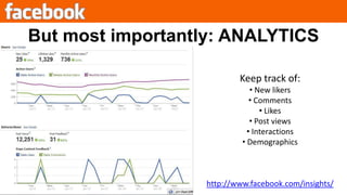 The document provides social media best practices for businesses using Facebook pages. It recommends imprinting visitors by controlling the first thing they see, spreading the word about the page using various marketing methods, optimizing the page URL for searchability, regularly posting engaging content like photos and videos to maintain the page, and interacting with fans to gain more fans. It also stresses the importance of monitoring page analytics over the long term to understand engagement.