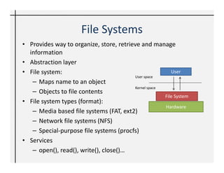 FUSE allows developers to create file systems in userspace without writing kernel code. It provides a virtual filesystem layer that intercepts system calls and redirects them to a userspace program. The seFS prototype uses FUSE to create an experimental file system that provides online data deduplication and compression using SQLite for storage. It demonstrates how FUSE enables rapid development of new file systems in Python by treating them as regular applications instead of kernel modules.