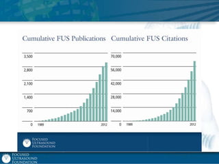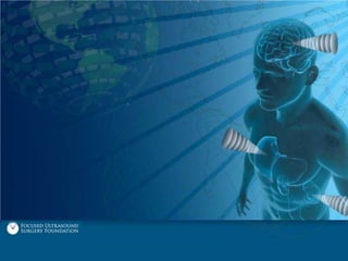 This document provides an overview of focused ultrasound technology. It discusses how focused ultrasound is a non-invasive therapeutic technology that can be used as an alternative or adjunct to surgery, radiation therapy, and drug delivery to treat conditions like tumors, metastatic cancer, Parkinson's disease, and back pain. It explains that focused ultrasound uses intersecting beams of ultrasound focused with precision to target and treat tissue while avoiding damage to surrounding areas. The document outlines the various effects it can have on tissue and discusses its applications and development. It positions focused ultrasound as a technology that could improve quality of life for millions of patients worldwide.