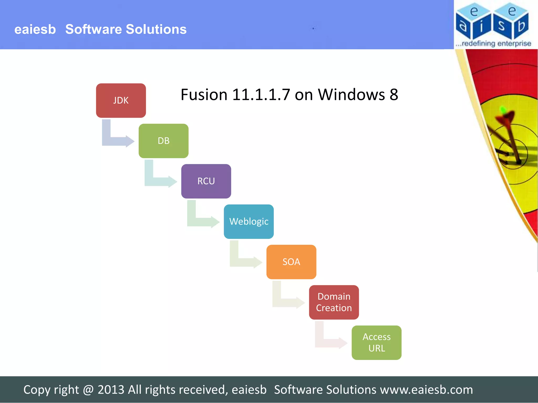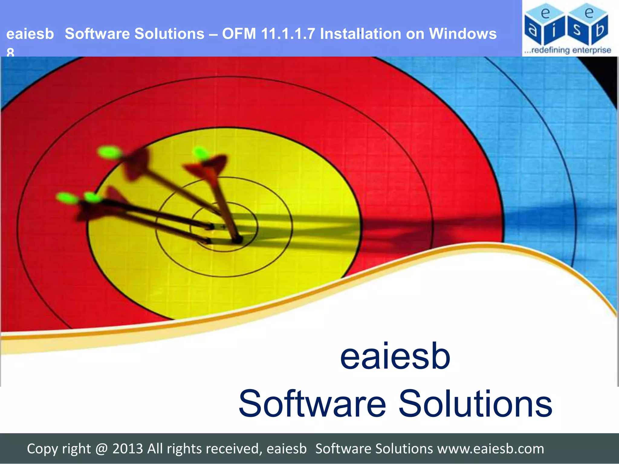 The document provides steps for installing Oracle Fusion Middleware 11.1.1.7 on Windows 8. It outlines installing the Java Development Kit (JDK), database, repository creation utilities (RCU), WebLogic server, service-oriented architecture (SOA), and creating domains to access the application URLs. Each section provides the installation steps for one of these components.