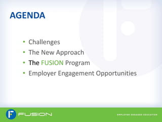 1) The FUSION program blends employer and educator perspectives to develop IT curriculum and place students in IT residencies with employer partners, in order to produce graduates with both technical skills and real-world experience.