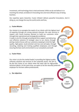 Fusion Infotech Ltd. is a software development and system integration company operating in Australia and Bangladesh, with over 10 years of ERP implementation experience and a robust team of certified professionals. The company aims to provide innovative and efficient technology solutions tailored to client needs while ensuring strong support and expertise across various industries. Fusion's mission is to become a market leader by delivering high-quality software solutions and maintaining beneficial partnerships with leading technology companies.