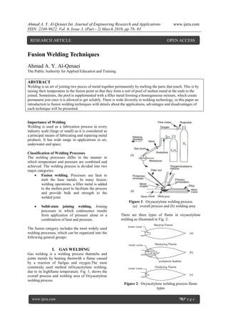 This document provides an overview of various fusion welding techniques, including gas welding (such as oxyacetylene welding), arc welding processes (such as shielded metal arc welding, gas tungsten arc welding, gas metal arc welding, plasma arc welding, submerged arc welding, and electroslag arc welding), and high energy beam welding techniques (such as electron beam welding and laser beam welding). For each technique, the document discusses the overall process, advantages, and disadvantages. The goal is to present an introduction to fusion welding technologies and details about the applications and characteristics of each technique.