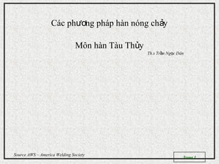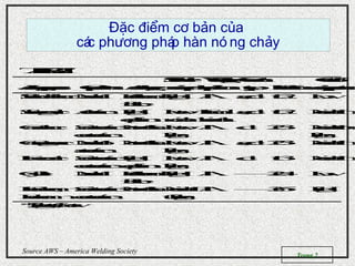 Tài liệu cung cấp thông tin chi tiết về các phương pháp hàn, bao gồm hàn bằng khí, hàn que, hàn hồ quang chìm và hàn MIG/MAG, cùng với sơ đồ nguyên lý và thiết bị liên quan. Nó cũng đề cập đến các yếu tố như tính linh hoạt, đòi hỏi về kỹ năng, và các chỉ số về chi phí thiết bị cho từng phương pháp. Thêm vào đó, tài liệu giải thích quy trình và ứng dụng của hàn oxy - axetylen, cũng như so sánh giữa các phương pháp hàn khác nhau.