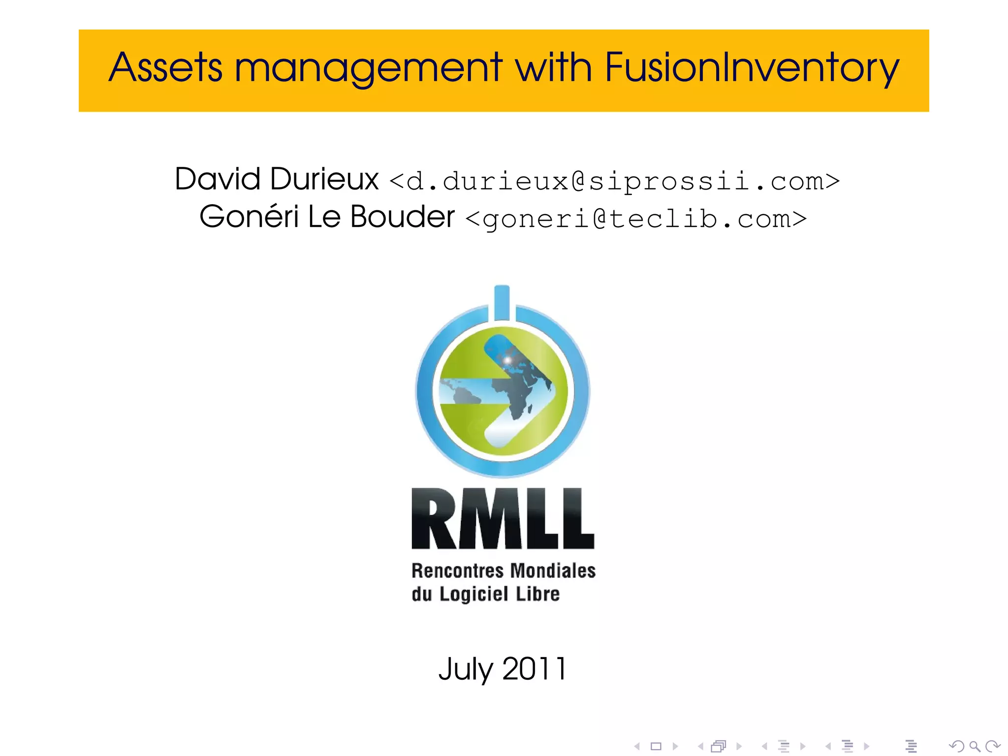 FusionInventory is an open source project that allows for asset management through the use of agents installed on endpoints that report inventory and status information to servers. It supports a wide range of operating systems and can perform network discovery, remote SNMP inventory, software deployment, and wake on LAN functions. The agent is installed directly on endpoints while servers integrate with asset management systems like GLPI. Installation of both the agent and servers is straightforward.
