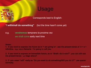 The document discusses the future tense in Spanish. It notes that the future tense corresponds best to the English phrase "I will/shall do something" and is used to refer to actions that have not yet occurred. It provides examples of how to express an immediate future using the present tense instead. Finally, it explains that the future tense is formed by adding endings derived from the present tense of haber to the verb stem, and lists some common irregular verbs in the future tense.