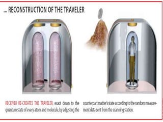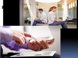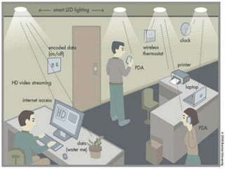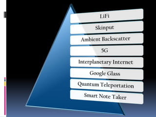 LI-Fi is a new technology that uses LED lights to transmit data wirelessly. It works by switching the LED lights on and off very fast to transmit digital 1s and 0s. This provides opportunities to transmit large amounts of data wirelessly through lights. 5G technology will provide complete wireless communication with almost no limitations, allowing high definition video streaming and faster data transmission speeds than previous generations. Skinput uses sensors in an armband to detect vibrations on the skin from finger taps, allowing users to control devices by tapping on their arm. Ambient backscatter harvests existing signals in the air and converts them to power wireless communication devices without needing an internal power source.