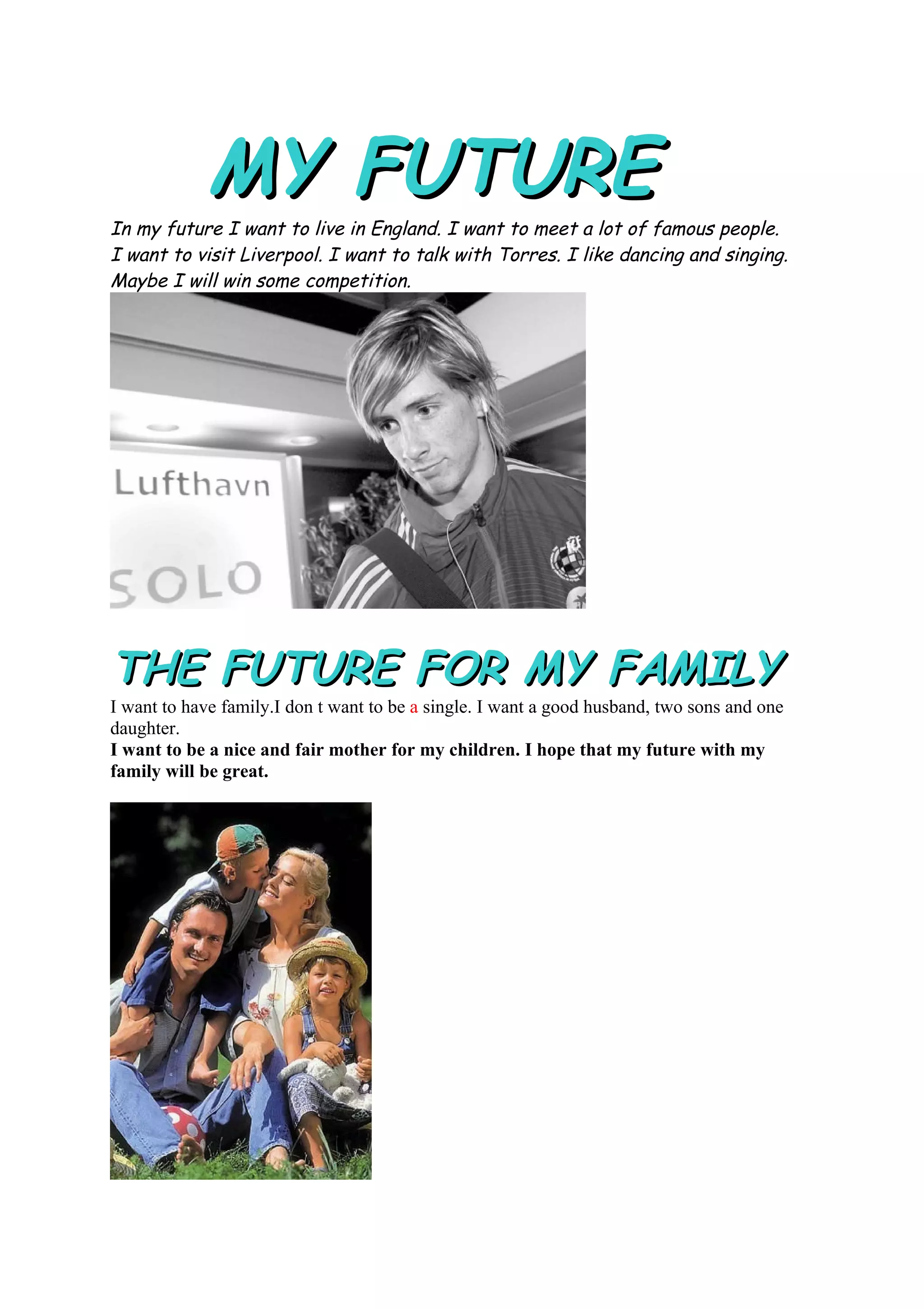 The document discusses the author's visions and predictions for their own future, their family's future, and the future of the world, space, work, and society more broadly based on a survey they conducted. Specifically, the author wants to live in England, meet famous people, visit Liverpool, and possibly win a competition in their own future. They want a husband, two sons, and a daughter and to be a good mother in their family's future. The author predicts more bad people, wars, and population movement in the world's future. They also foresee more space travel and potential habitation of new planets. The author is unsure of their career but hopes to work in England as a doctor or lawyer. A survey they conducted