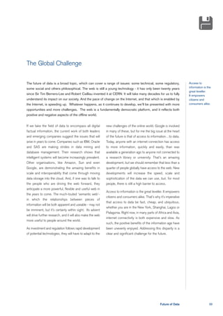 The document discusses the future of data and access to information. It notes that while the internet has enabled more access to information, less than a quarter of people globally have internet access. It argues that making data access fast, cheap, and ubiquitous worldwide would be an important challenge. The document also discusses how emerging technologies may improve access, such as mobile phones and cloud computing, but connectivity issues still exist in some areas. Overall it frames increased access to data and information as empowering and beneficial.