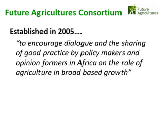 The Future Agricultures Consortium, established in 2005, focuses on fostering dialogue, conducting policy-relevant research, and promoting agricultural policy debates in Africa. Key research themes include policy processes, commercialization, social protection, and the impact of climate change on agriculture, with an aim to strengthen agricultural performance across various countries. The consortium plans to transfer its secretariat to Africa by 2013 to enhance its local engagement and capacity-building efforts.