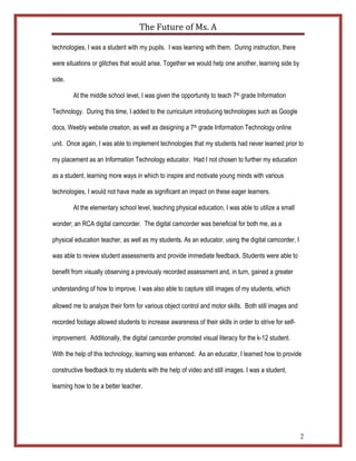 The document discusses how the author has become a lifelong learner by obtaining a Master's degree in Educational Technology. Through the program, she learned how to implement various technologies like webquests, blogs, and digital cameras into her K-12 teaching. This helped motivate and engage her students. As a teacher, she sees herself as both an educator and student, constantly learning and improving her skills. The program has given her more confidence in integrating technology into her teaching approach. She is committed to continuing her education to find new ways to inspire students through innovative instruction.