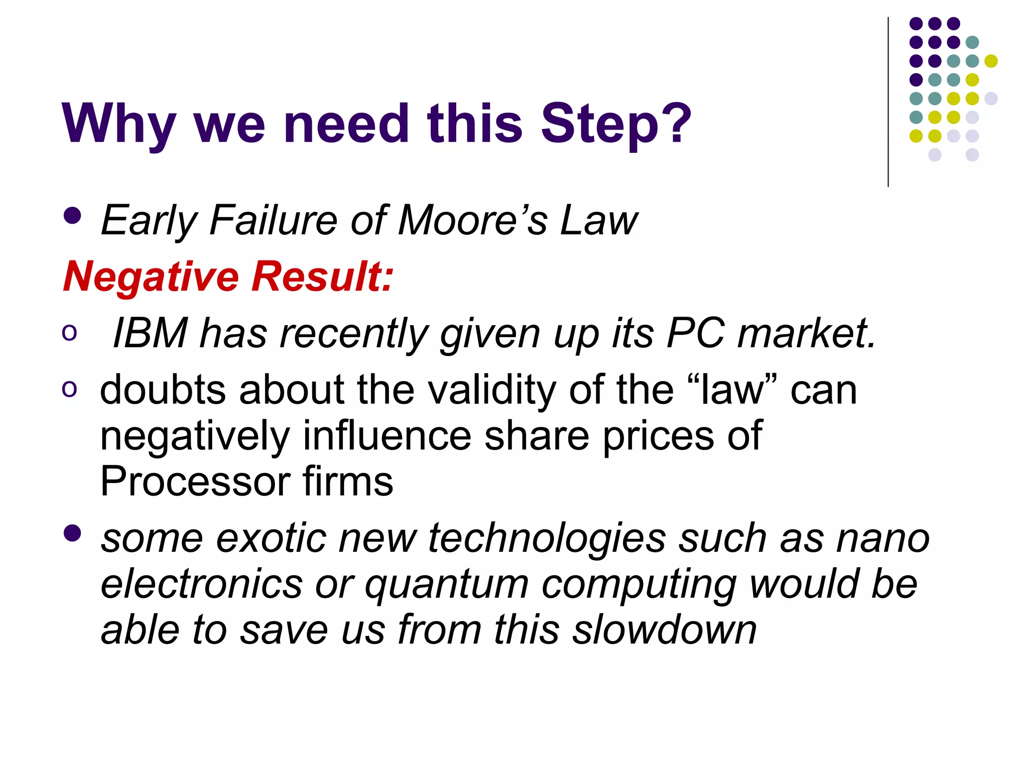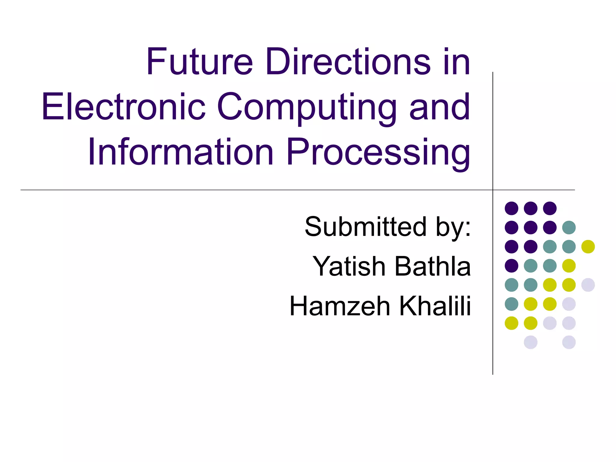 This document discusses future directions for electronic computing as Moore's Law reaches its limits. [1] Moore's Law, which stated that the number of transistors on a chip doubles every two years, is failing as physical limits are reached. [2] Quantum computing and new technologies like single-electron transistors are discussed as potential ways to continue advancing computing power beyond conventional chips, but each faces challenges. [3] The conclusion is that while hardware performance growth has slowed, software efficiency improvements may still provide gains, and new computing architectures like parallel processing, analog, optical, and quantum computers will likely play a larger role going forward.