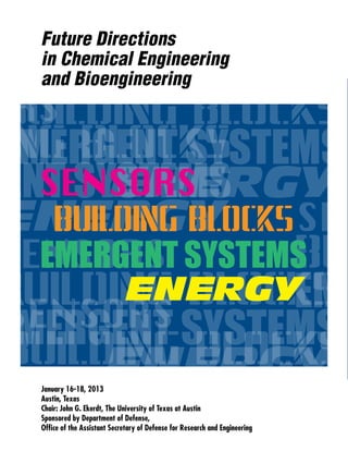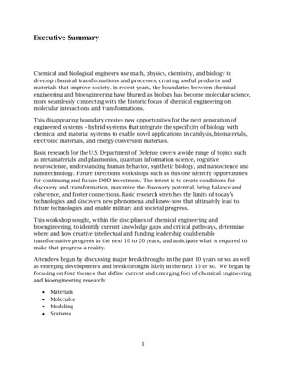 The document focuses on the future directions of chemical and bioengineering, emphasizing the integration of these fields and the need for innovative research to address knowledge gaps. Key areas identified for advancement include the synthesis of materials, optimization methods, and the development of hybrid systems that leverage biological specificity. The workshop seeks to inform U.S. Department of Defense investments to foster transformative research and technology that enhances military capabilities and societal progress over the next 10 to 20 years.