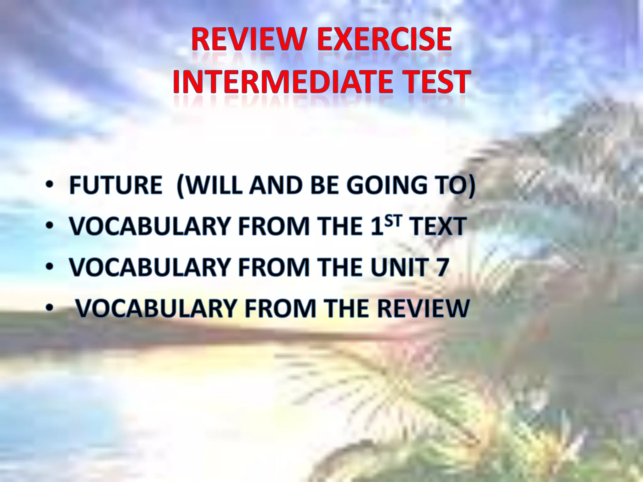 This document contains a review exercise with intermediate level tests on future tenses using will and be going to, vocabulary from different units and reviews, and a translation passage. It includes 10 multiple choice questions to complete sentences using the appropriate future tenses, and a short translated passage about an event planner who has been online dating for over two and a half years and found lasting friendships even if not finding true love.
