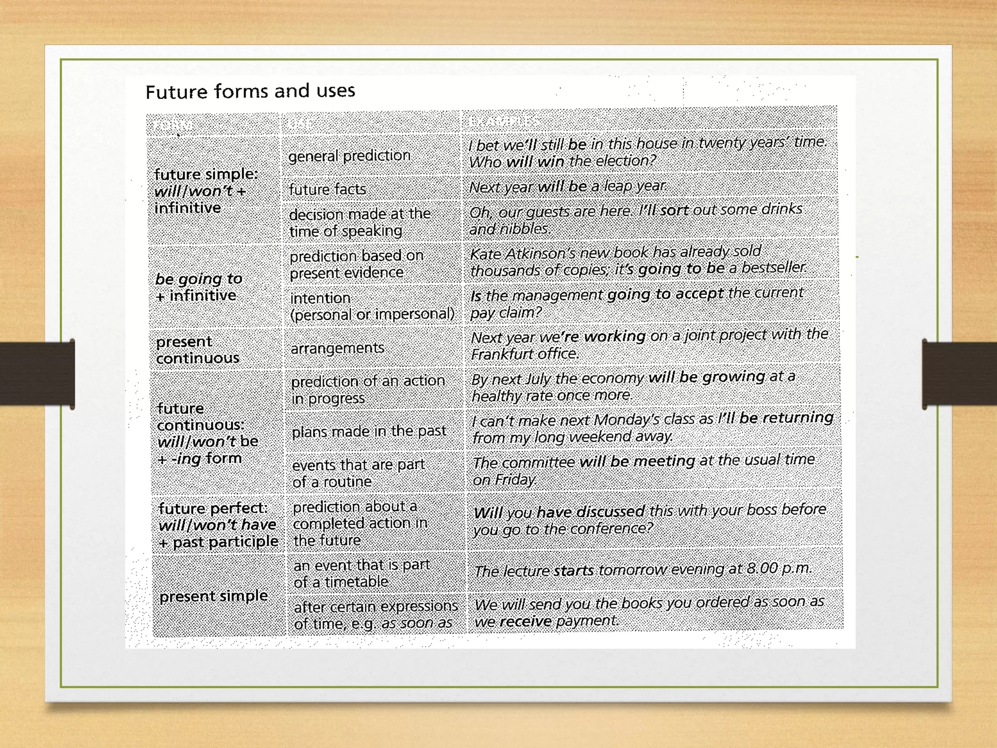 3. The difference between be going to for intentions and present continuous for plans/arrangements.