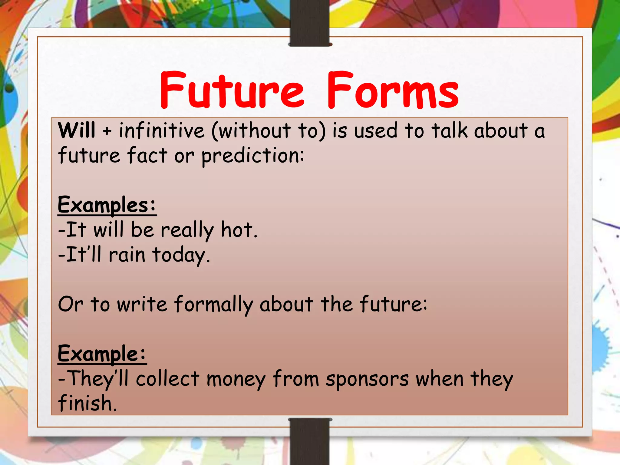 This document discusses three ways to talk about the future in English: will + infinitive is used to talk about predictions or future facts, be + going to + infinitive is used to talk about future plans, and the simple present can be used to talk about scheduled future events or timetables such as dates. Examples are provided for each structure.