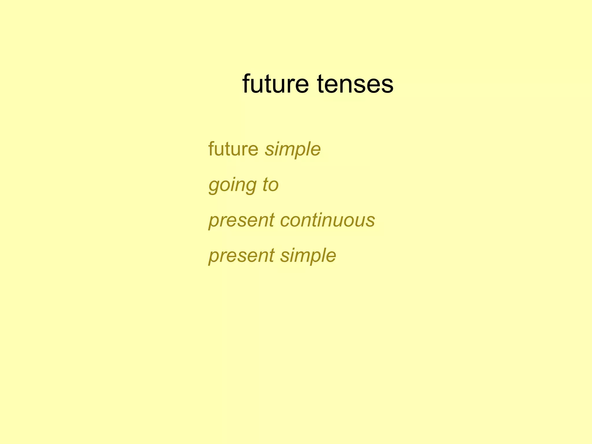 This document provides information about different English tenses used to discuss future events: