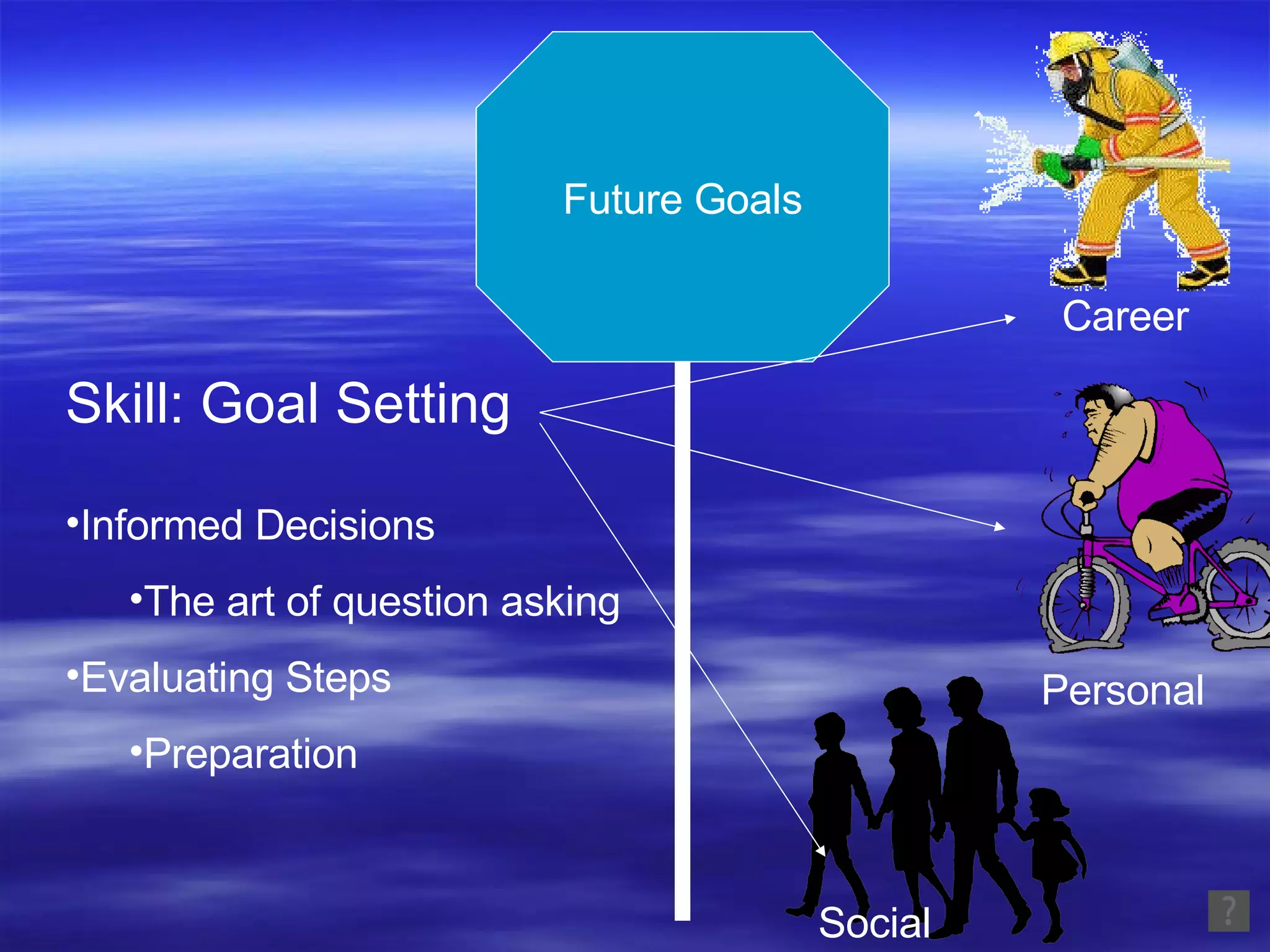 The document outlines a structured program focused on goal setting and informed decision-making through various stages. It includes career research activities, discussions on the relevance of chosen careers for the future, and a game where students creatively maintain their career choices. The final stage involves a class discussion to reflect on the relevance of chosen careers by the year 2020.