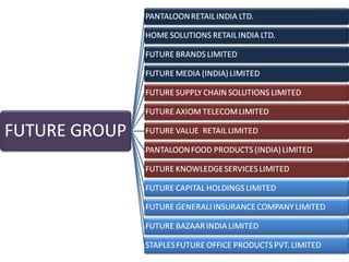 This document provides information about Future Group, an Indian retail conglomerate. It details that Kishore Biyani founded Pantaloon Retail in 1997 and launched India's first hypermarket format called Big Bazaar in 2001. In 2006, Future Group was formed to consolidate Kishore Biyani's various retail, brand, logistics and media initiatives. The group's vision is to deliver everything to every Indian consumer in the most profitable way. It provides an overview of Future Group's various retail formats and organizational structure.