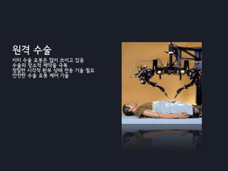 The document discusses the future of health management systems with ubiquitous equipment. It describes how personal health management will be portable, networked to allow sharing of information, and focused on health quality. It discusses trends towards well-being, welfare, and aging life. Future health care could utilize computer, communication, imaginary interfaces, and robotics. Scenarios shown include estimation and prevention through tagging and monitoring from birth through adulthood, care and healing through personalized at-home treatment, and accessibility through robotics and remote assistance. The goal is personalized health care and management focused on high health quality.