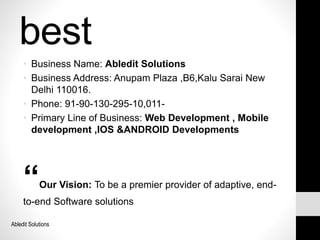 Abledit Solutions is a web and mobile development agency based in New Delhi, aiming to provide comprehensive solutions for startups and enterprises. They have developed a mobile application called 'Hotel Plus' to enhance guest experiences in hotels by simplifying service access and improving communication. The app addresses common hotel guest issues and features functionalities like reservations, live chat, and push notifications to improve guest satisfaction and operational efficiency.