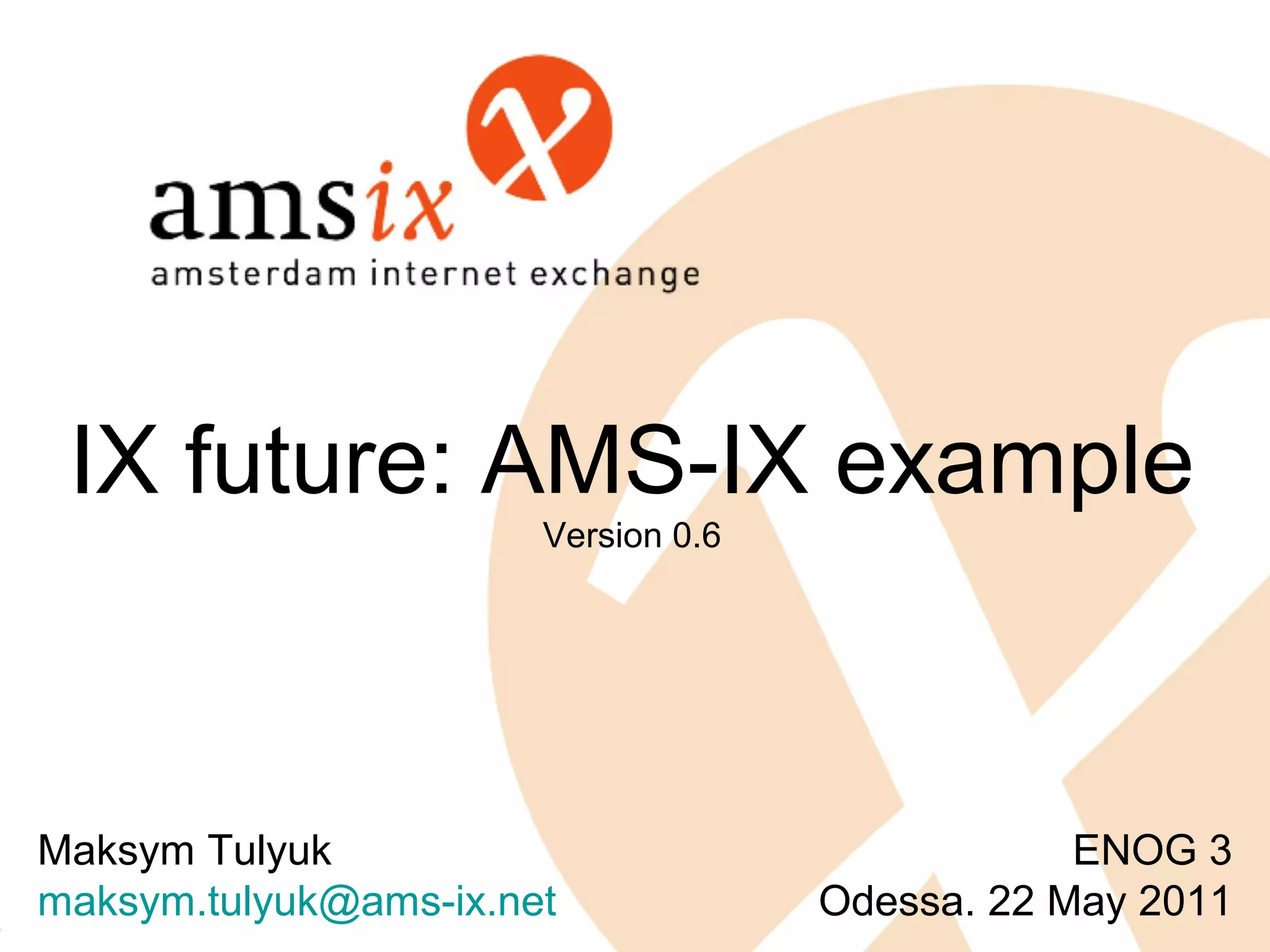 This document discusses the future of AMS-IX and key trends. It notes that growth is slowing and the market is stabilizing. AMS-IX is focusing on evolutionary services like IPv6, GRX/IPX, opening new sites, and introducing 100Gbit ports. Revolutionary services include offering SLAs, expanding its reseller program, and opening an exchange in Hong Kong. Key components are its community emphasis on collaboration, building a redundant network, and expanding its technical team. AMS-IX aims to continue growing through new technologies and opportunities while cooperating closely with partners.