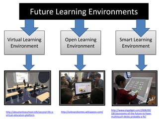 The document discusses future learning environments including virtual learning environments, open learning environments, and smart learning environments. It provides examples of how these environments are being used such as virtual classrooms, lectures, and tours in Second Life. Open learning environments aim to effectively support student learning through exploration and help when needed. Smart learning environments incorporate feedback from sensors and smart objects to enhance learning. Privacy, security, and trust are important considerations for future learning technologies.