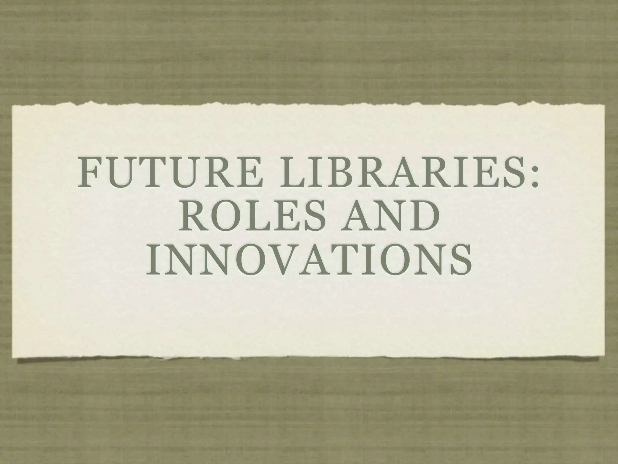The document discusses potential future roles and innovations for libraries. It explores ideas like libraries becoming community centers that provide food, entertainment and services. It also discusses technological innovations like enhanced shelves that allow browsing and searching physical and digital materials simultaneously, and reading stations that provide context about materials through tools like optical character recognition. The document advocates for libraries to embrace these types of changes in order to remain relevant in the future.
