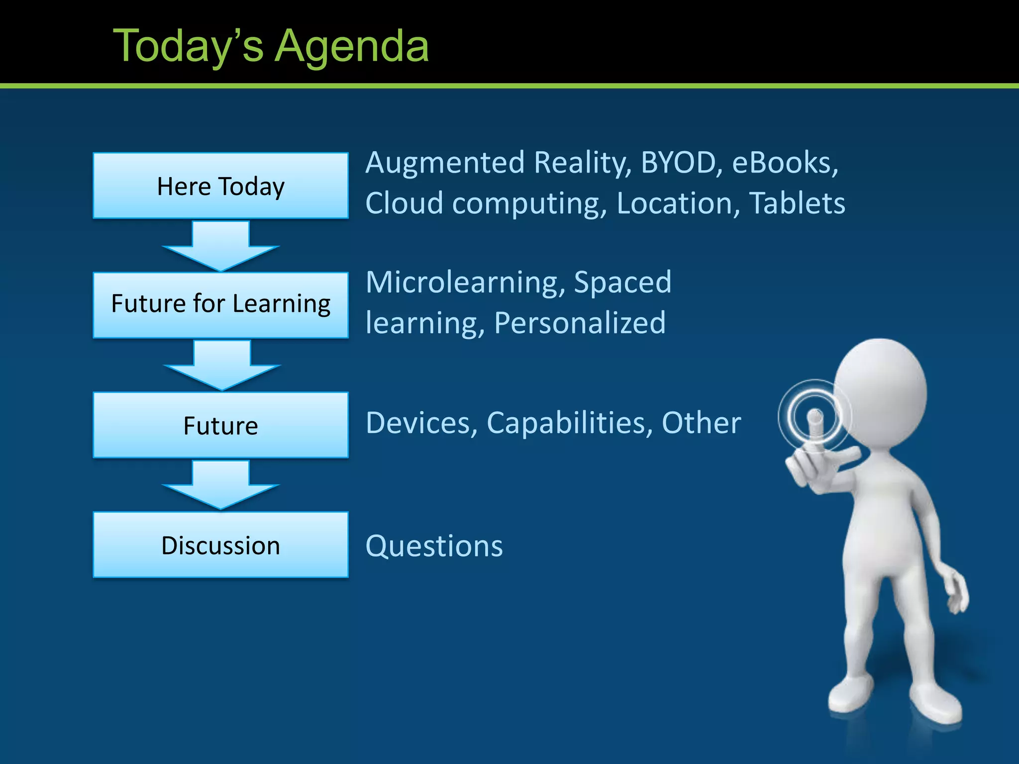 The document provides an agenda for a discussion on the future of learning and educational technology. It outlines several emerging technologies like augmented reality, BYOD, eBooks, cloud computing, tablets, and microlearning. It discusses issues and benefits of these technologies. It also explores future capabilities of devices like ubiquitous connectivity, personalized content, and multi-sensory interfaces. Examples of developing technologies presented include flexible screens, smart contact lenses, gesture recognition, and power generation from human movement. The document aims to spark discussion on how these technologies may impact and transform learning in the future.
