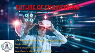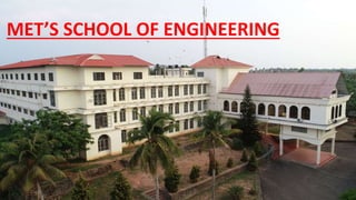 The document discusses the future of engineering and provides details about MET's School of Engineering. It lists the undergraduate and postgraduate courses offered including civil engineering, mechanical engineering, biotechnology engineering, computer science and engineering, and artificial intelligence and data science at the undergraduate level. The postgraduate courses listed are cyber security and bioprocess engineering. It also includes photos from various events held at the school.