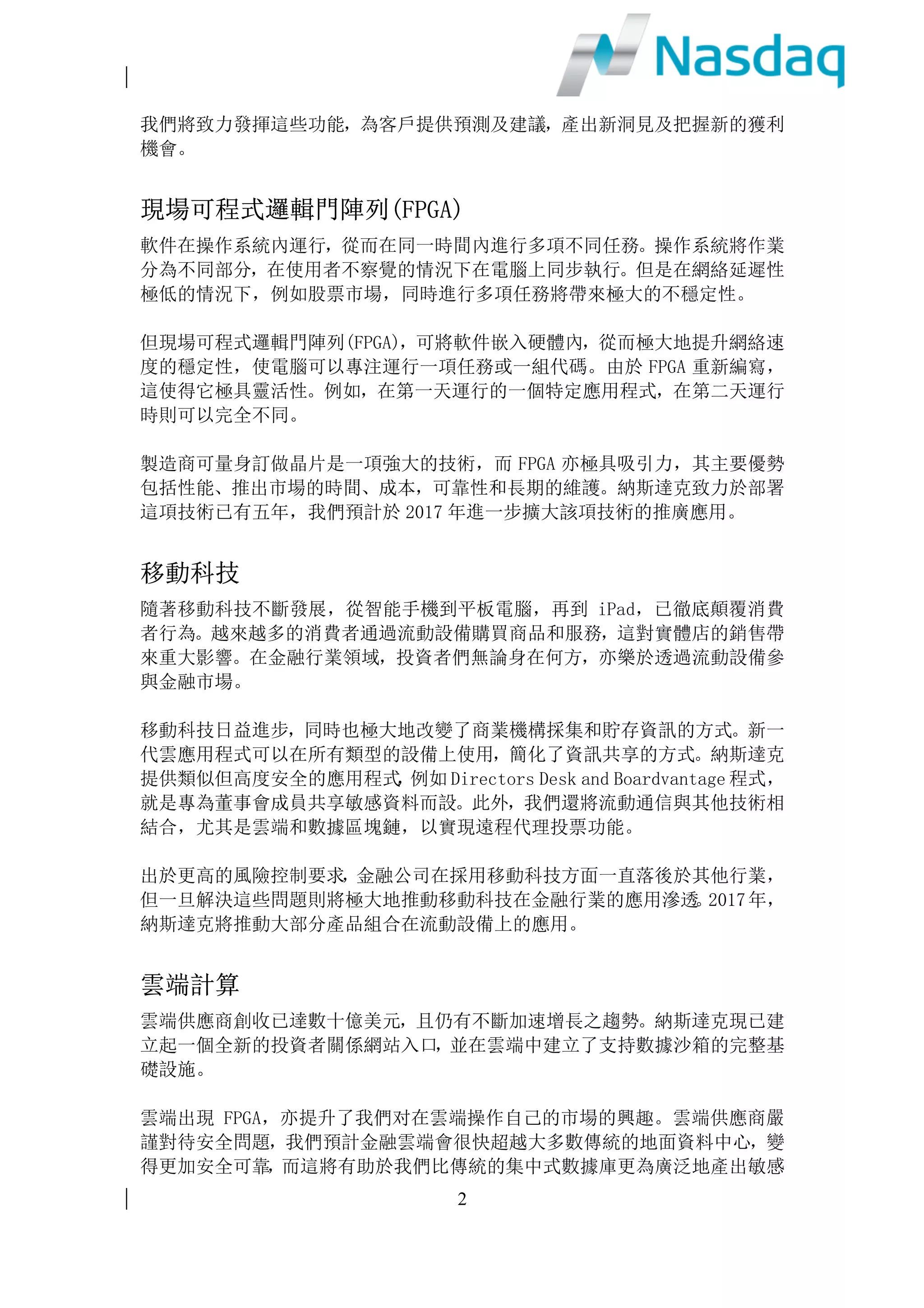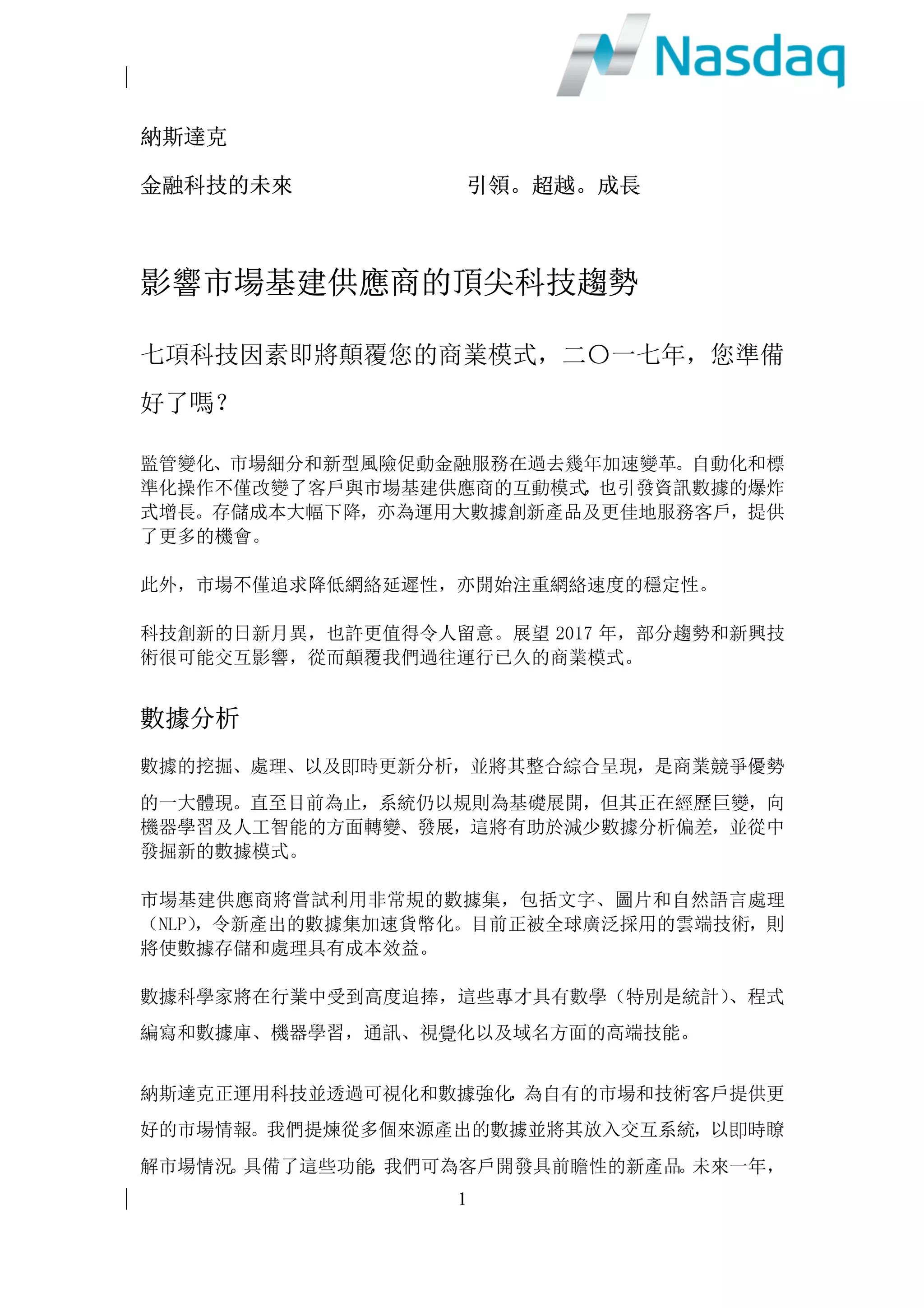 該文檔討論了金融科技的未來和將影響市場基建供應商的七項技術趨勢,包括數據分析、FPGA、移動科技和雲端計算,這些趨勢將在2017年重新定義商業模式。自動化和標準化的操作促進了信息的增長,刺激了對大數據和雲技術的需求。納斯達克正致力於利用這些技術來提升市場資訊和客戶服務,並推動金融行業的應用滲透。