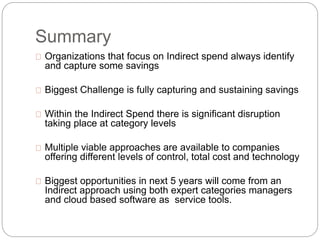 Chief purchasing officers are refocusing on indirect spend to capture savings amid significant disruptions in various categories. Companies must utilize a blend of expert category managers and cloud-based software to optimize indirect spend, as sustaining savings remains a key challenge. Future trends indicate a shift towards hybrid approaches that integrate strategic sourcing with SaaS solutions to enhance efficiency and cost savings in indirect purchasing.