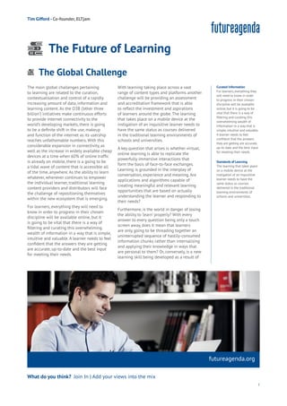 The document discusses the evolving landscape of learning shaped by increased internet connectivity and the rise of mobile learning, emphasizing the need for efficient curation of vast information. It highlights challenges such as ensuring the quality and relevance of learning content, replicating face-to-face interactions in a virtual environment, and the development of new pedagogical models that focus on collaboration and personalization. The authors advocate for embracing adaptive learning technologies and crowd-sourced solutions to facilitate a more interactive and engaged learning ecosystem.