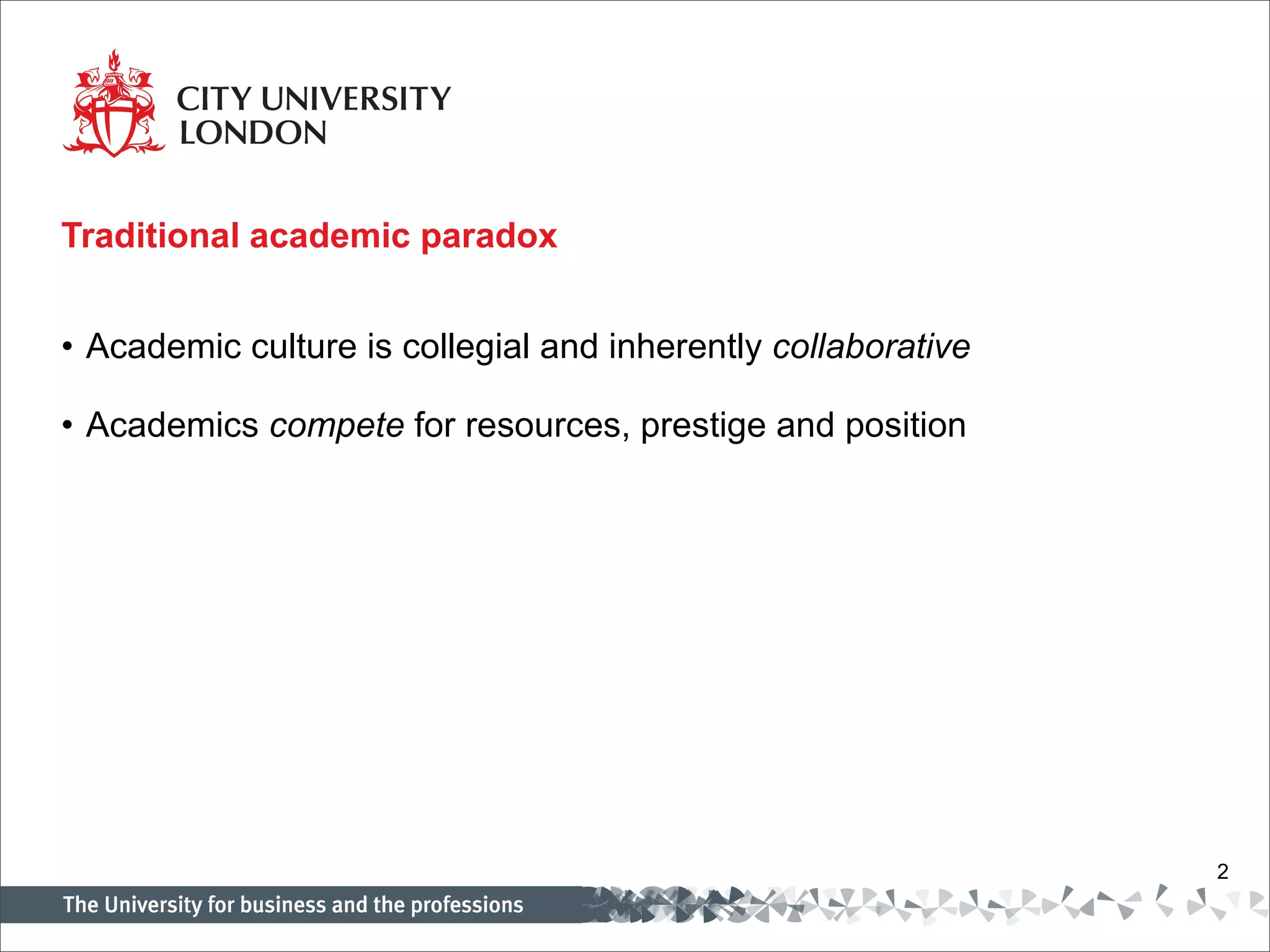 Professor Paul Curran discussed the increasing competitiveness yet continued collaboration within universities. While universities compete for resources, prestige, and students, academics often ignore boundaries and collaborate through activities like joint publications and committees. The most competitive universities tend to also be the most collaborative. Universities must collaborate in some areas, like student exchanges and joint programs, to effectively compete. Professor Curran highlighted the World Cities World Class University Network, which connects top universities in major cities worldwide in specific subject areas to improve rankings and win grants through collaboration despite competition.
