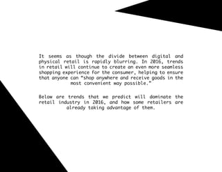 The document discusses the evolving landscape of retail in 2016, highlighting trends such as the Internet of Things, social integration, and omnichannel strategies that aim to create a seamless shopping experience. It emphasizes the importance of customer engagement through interactive experiences, personalized services, and security measures in a competitive market. Creative CNTRL, a marketing agency, is introduced as a key player in enhancing brand loyalty and consumer connections through experiential marketing and pop-up shops.