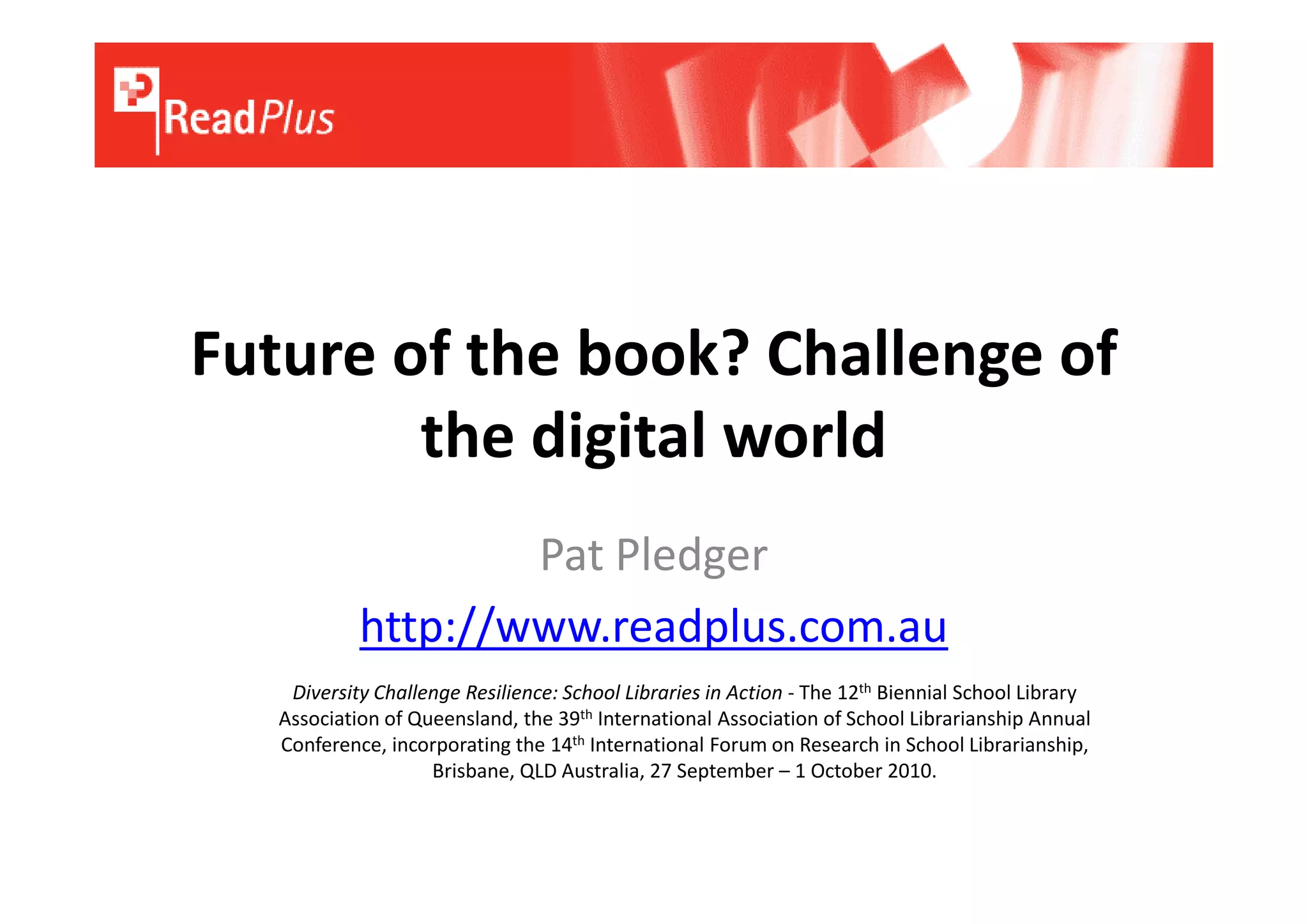 The document discusses the impact of digital technology on books, focusing on e-books and e-book readers. It outlines the advantages and disadvantages of e-books, highlights various platforms and formats, and examines future trends in e-book technology. Additionally, it addresses challenges in classroom use and concludes that while e-book devices are increasing in variety, printed books still remain preferred by many users.