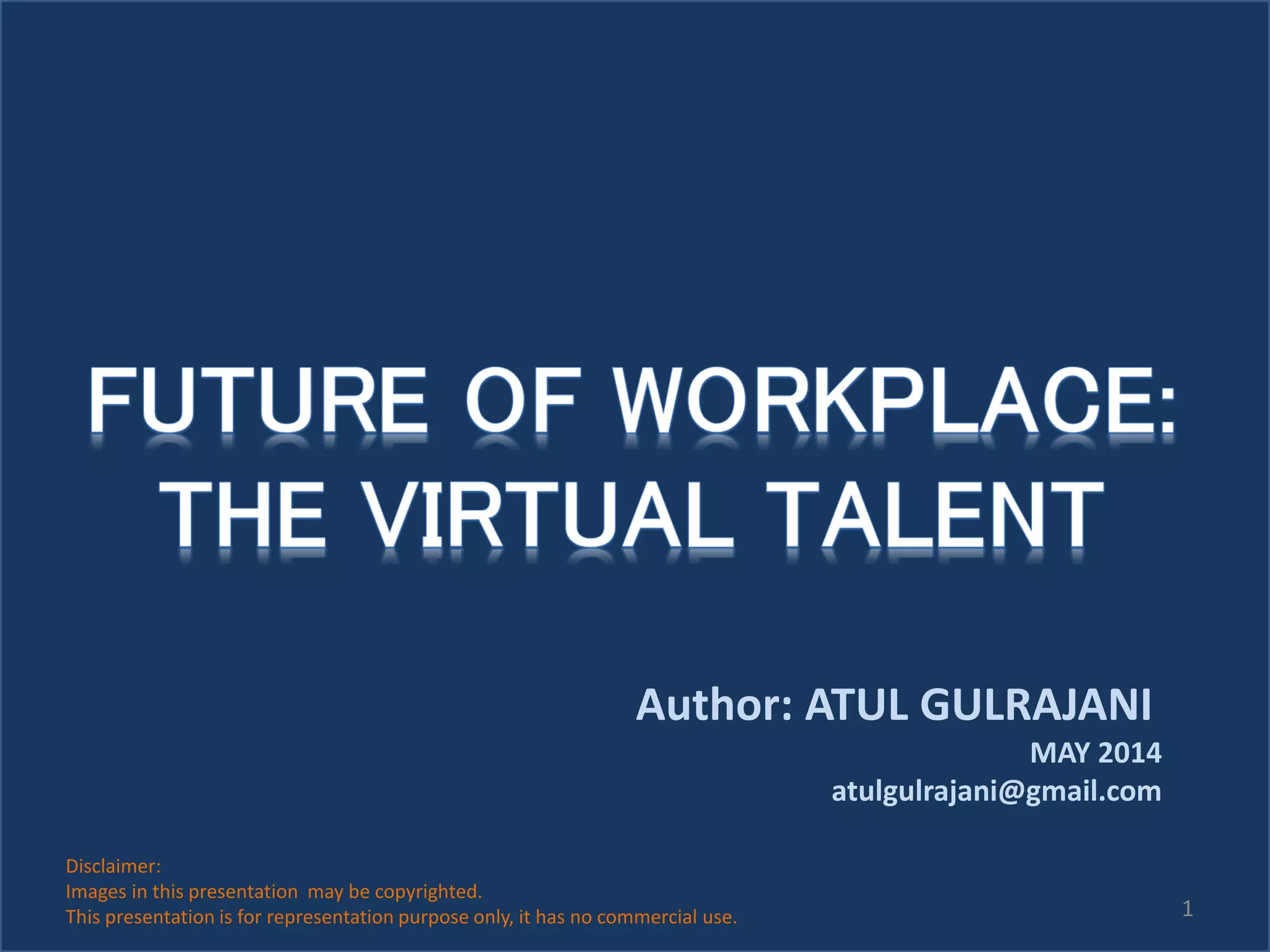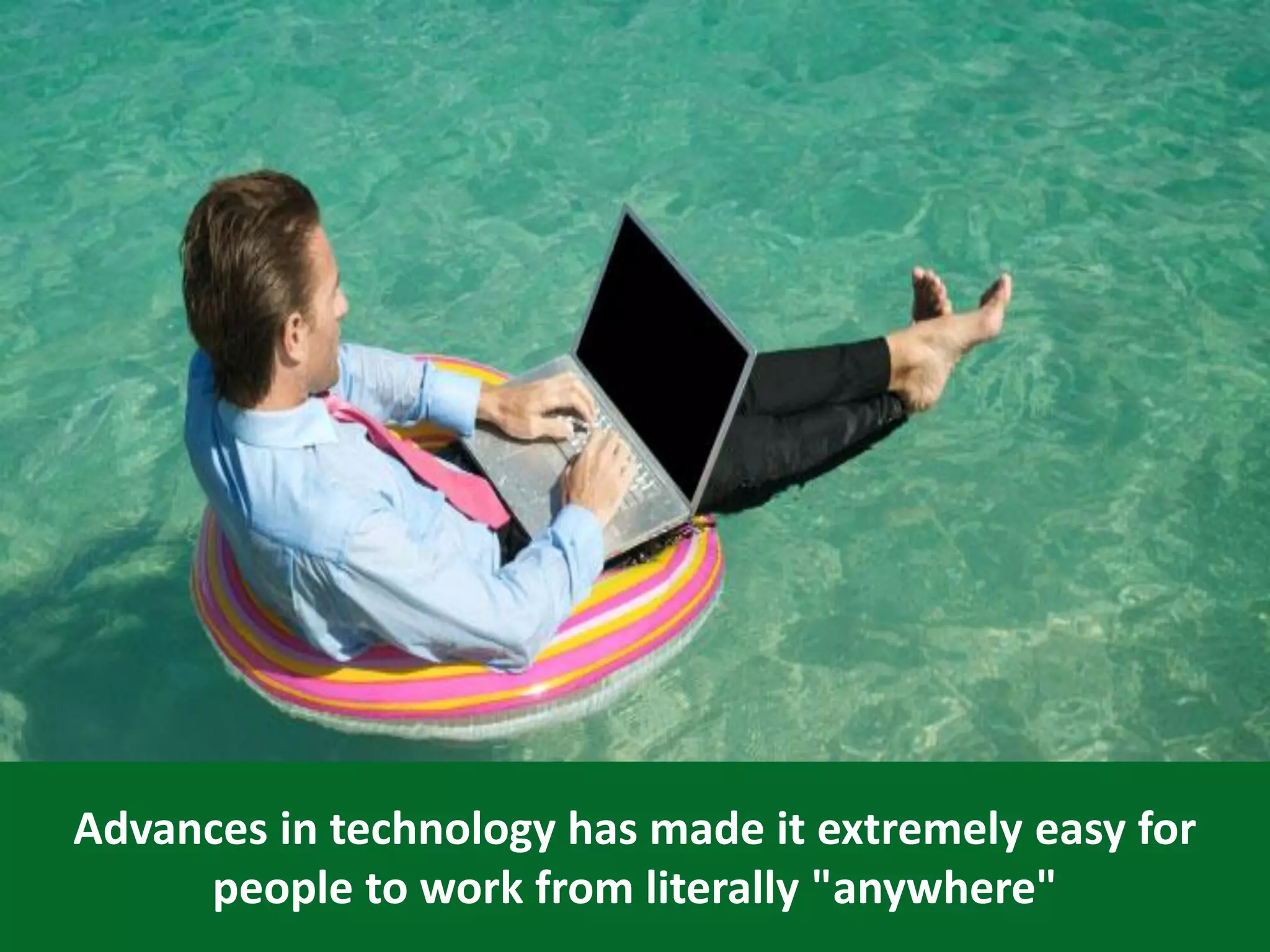The document discusses the shift towards remote work facilitated by advancements in technology, highlighting that both employers and employees are increasingly favoring flexible work arrangements. With a significant increase in freelancers, businesses need to adapt by building virtual talent to stay competitive, as this trend also impacts various sectors including real estate and childcare. Furthermore, the document emphasizes the necessity for businesses to develop efficient solutions and consider new business models to thrive in this changing landscape.