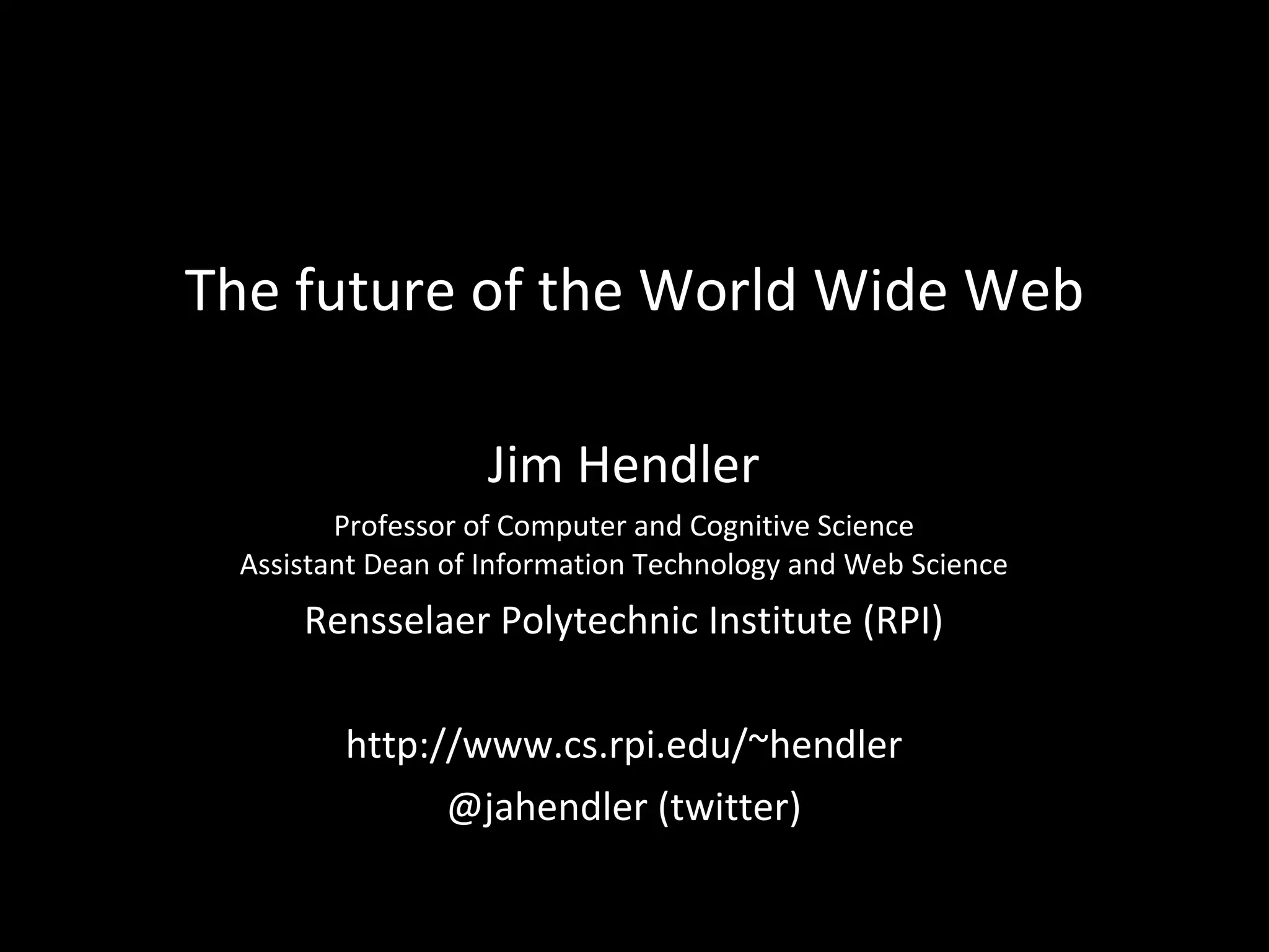 Jim Hendler explores the evolution of the World Wide Web from Web 1.0 to Web 2.0 and anticipates the emergence of Web 3.0, emphasizing trends in social media, mobile technology, and big data. He predicts that social machines will redefine how we interact with the web and how government data is shared, while noting the rapid growth of data generation. The future of the web is shaped by its users, particularly digital natives in countries like India.